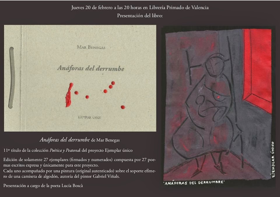 Amigas y amigos: El próximo jueves 20 de febrero a las 20:00 en Libreria Primado os esperamos para brindar por “Anáforas del derrumbre” de Mar Benegas (11º título de la colección “Poética y peatonal” de Ejemplar único.