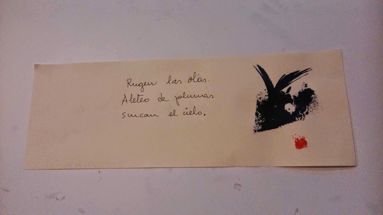 Y es que tanto arte junto, no podía dejar otras maravillas. El domingo hicimos el taller de haikus, y como la idea es abrir puertas y que todo se mezcle, se me ocurrió que Antonio Santos y Susana Rosique (ilustradores) realizarna, in situ, los haigas para ilustrar los poemas. Unos haigas muy especiales, realizados en tinta, exclusivos y originales, en ese momento, el resultado fue así fantástico: