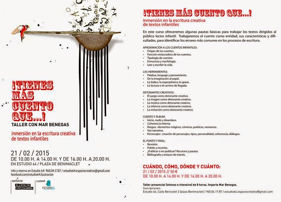 Abierta la inscripción para el taller presencial del día 21 de febrero, en Benimaclet, en Espacio 64. Plazas limitadas. Inscripciones: 960041787 o en la dirección: estudio64.espaciocreativo@gmail.com